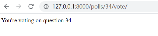 将新视图添加进 polls.urls模块from django.urls import path from . import views urlpatterns = [ # ex: /polls/ path('', views.index, name='index'), # ex: /polls/5/ path('<int:question_id>/', views.detail, name='detail'), # ex: /polls/5/results/ path('<int:question_id>/results/', views.results, name='results'), # ex: /polls/5/vote/ path('<int:question_id>/vote/', views.vote, name='vote'), ]请求网站页面时,以 polls/34/vote/为例,Django会载入mysite.urls模块,寻找urlpatterns中的匹配项:# mysite/urls.py urlpatterns = [ path('polls/', include('polls.urls')), path('admin/', admin.site.urls), ]找到匹配项 polls/后,切掉匹配的文本(polls/),将剩余文本(34/vote/)发送至polls.urlsURLconf做进一步处理。在polls.urls中,剩余文本匹配了<int:question_id>/vote/,使得Django调用views.py中的vote():vote(request=<HttpRequest object>, question_id=34)页面显示: ![]()