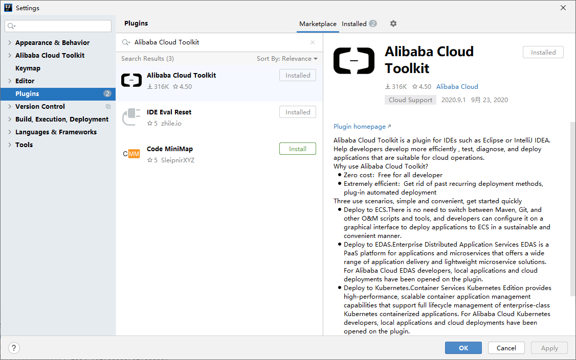 在搜索框中输入插件名称:Alibaba Cloud Toolkit