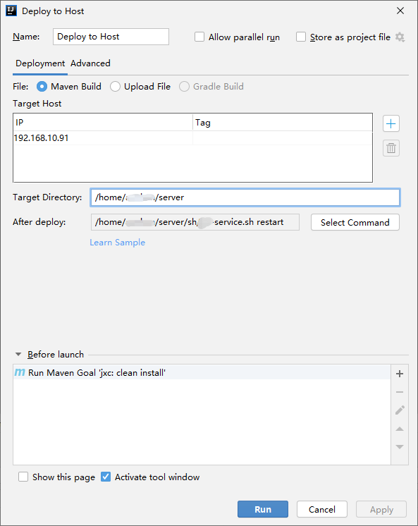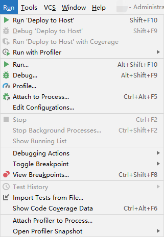 会在Run菜单中多出来:Run 'Deploy to Host'这个选项,点击后会重新编译项目,编辑成功后会自动打包到所配置服务器,并执行命令。