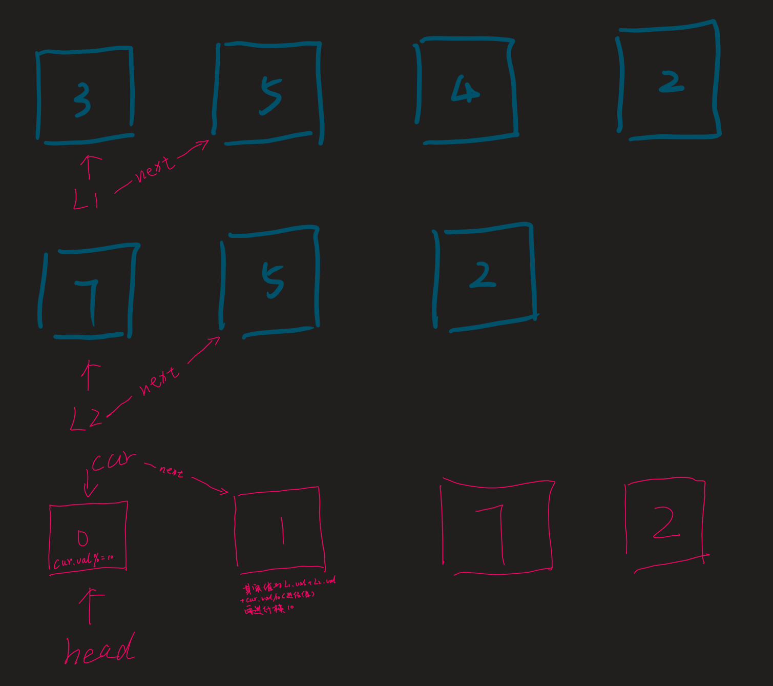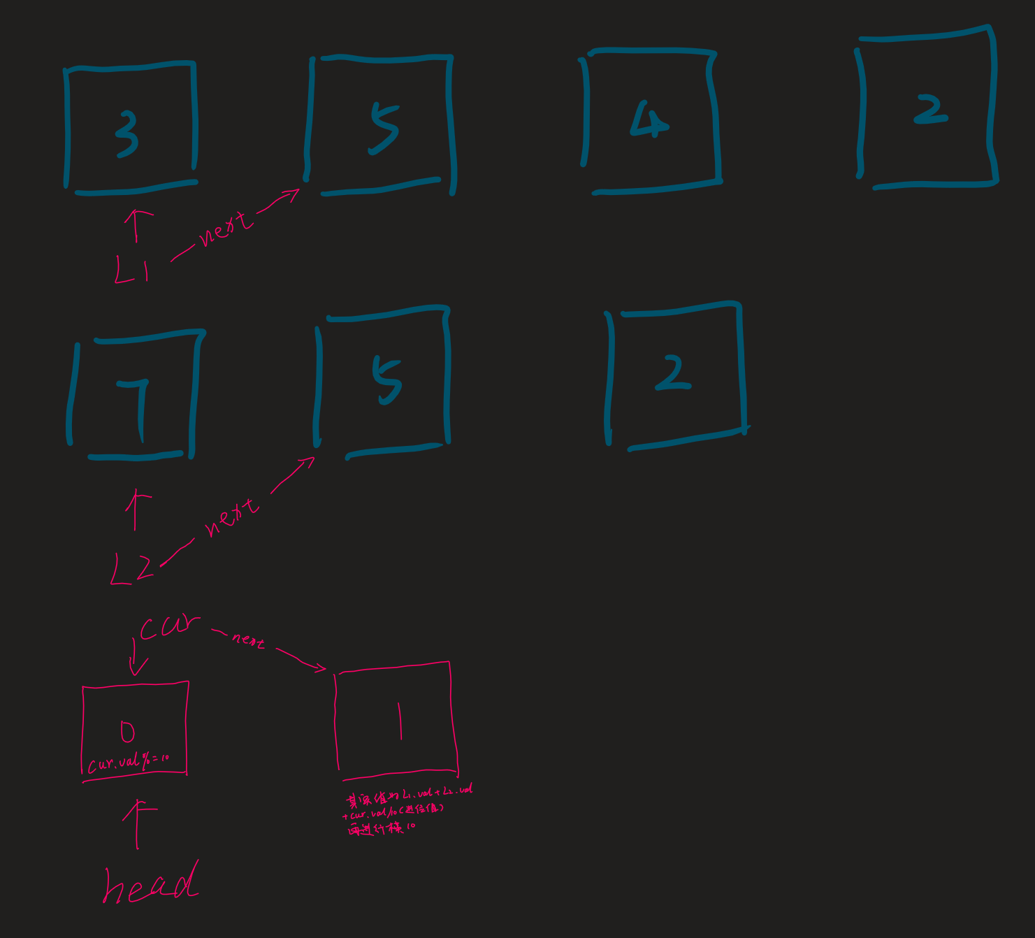 两链表的节点值之和可能会大于9,此时则会向后产生一个进位(链表节点值范围[0, 9],节点值和范围为[0, 18])。故cur的下一个节点值为