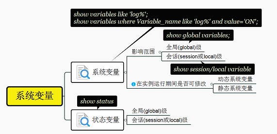 MySQL中的变量通常定义了某种内存结构有多大等设置,这些变量可以分为系统变量和状态变量,如下图示: