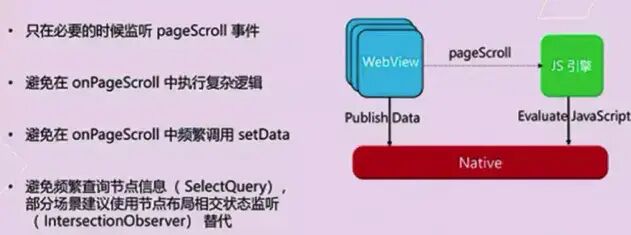 pageScroll 事件,也是一次通讯,是webview层向js逻辑层的通讯。这次通讯也是开销较大,如果考虑到这个事件被频繁的调用,回调函数如果有复杂的setData的话,emmmmm, 性能就会很差了。