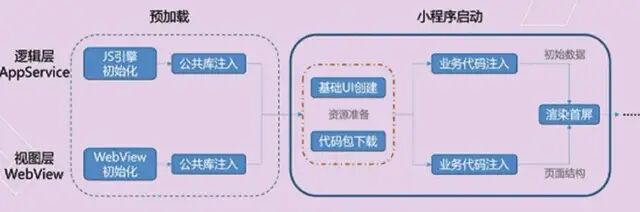 下图中,左侧的“预加载”对应的是运行环境的预加载,右侧的“小程序启动” 对应的是下载代码包启动小程序。