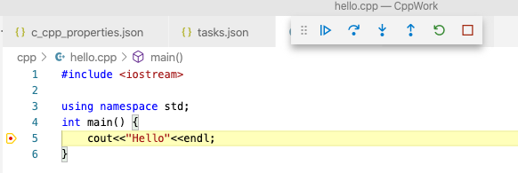 - 测试调试,在cpp/hello.cpp第5行添加断点,将看到断点调试效果