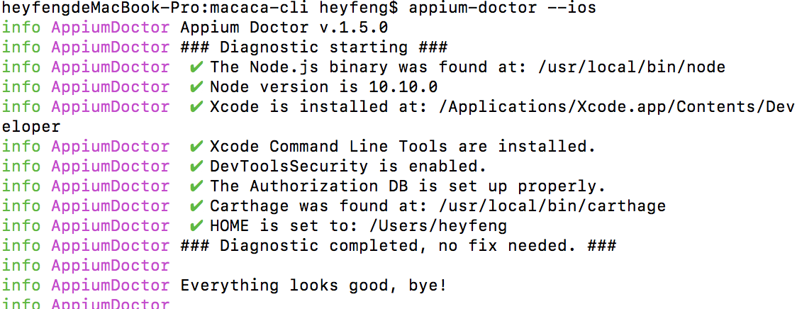 安装后执行appium-doctor --ios指令,可以查看与iOS相关配置是否完整,下图是全部配置都成功