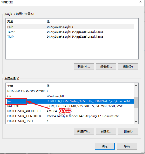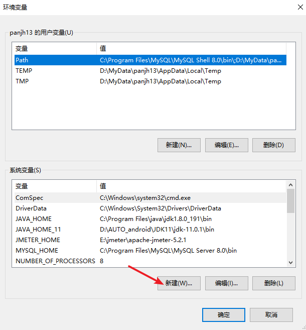 7、新建path,输入%JAVA_HOME%\bin;%JAVA_HOME%\jre\bin;点击【确定】