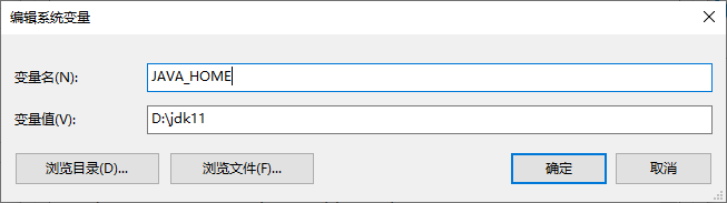 5、创建JAVA_HOME,变量名输入:JAVA_HOME,变量值输入:D:\jdk11 提醒:千万这里别写\bin,不然会提示不是内部命令