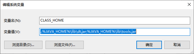 6、创建CLASS_HOME,变量名输入:CLASS_HOME,变量值输入:.;%JAVA_HOME%\lib\dt.jar;%JAVA_HOME%\lib\tools.jar提醒:.;%JAVA_HOME%\lib\dt.jar;%JAVA_HOME%\lib\tools.jar注意前面的.表示当前目录。然后点击“确定”按钮