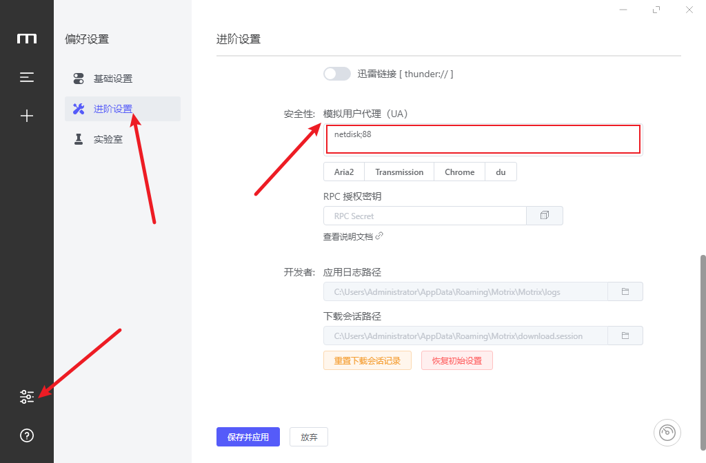 按照图片打开设置,找到“进阶设置”,找到安全性:模拟用户代理(UA)
