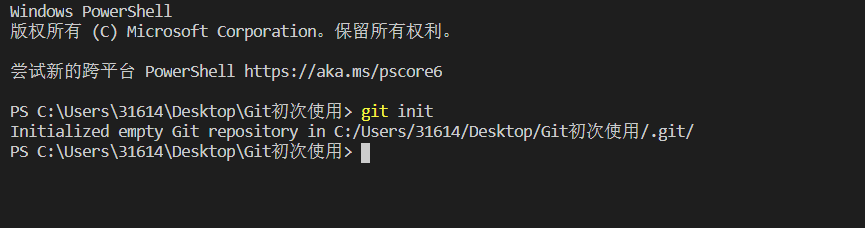 之后当我在vscode中打开"Git初次使用",并在终端输入Git init后,可发现在“Git初次使用”这个文件夹内部生成了一个名为.git的隐藏文件,这表明已经完成了仓库的初始化。