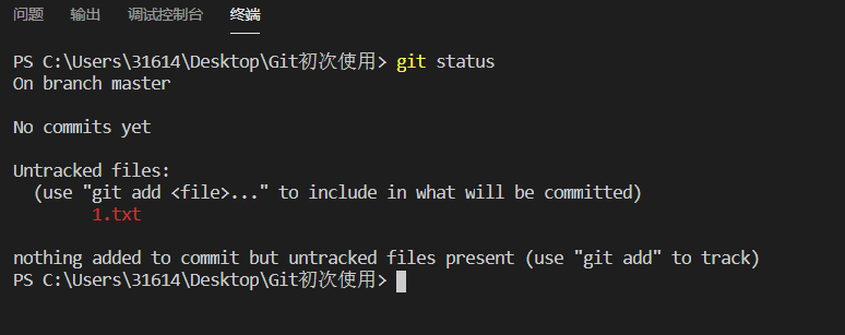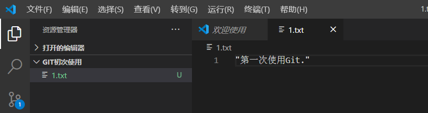 之后我在“Git初次使用”这个文件夹内部再创建了一个1.txt的文本文件,下面两个图分别展示了1.txt文件的新添的内容与在终端输入git status后的作用。