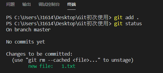 可以看到,在执行了git add .这条命令后1.txt文件已经被追踪。