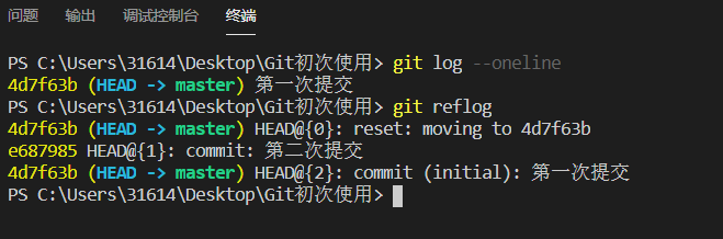 上图便是git log --oneline和git reflog这两条命令的结果对比。
