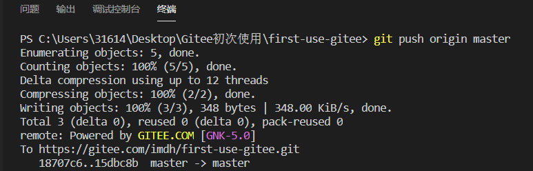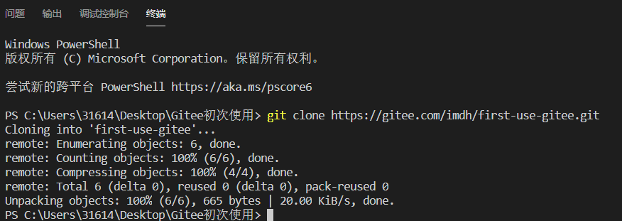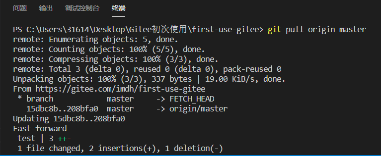 从上图可以看到已经将远端版本库克隆至本地,接着路径切换到first-use-gitee文件夹下进行其他操作。