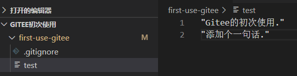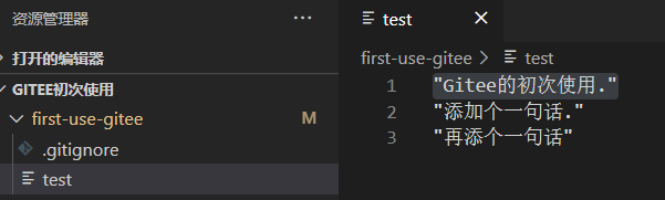 在上图中,可以很清楚的看到Gitee中的远端仓库的test文件内容多了一句话,实现了与本地库的同步。
