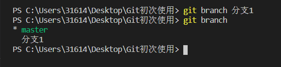 从上图可见,当前创建了一个名为“分支1”的分支,还有一个默认的master主分支,并且*在master分支前,说明现在处在master分支上。