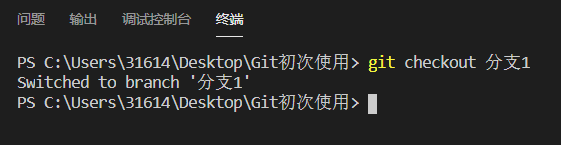 如果我们要切换到分支1,那么我们就要用到git checkout指令进行这个操作。这里我们用的是"git checkout 分支1"这条指令。