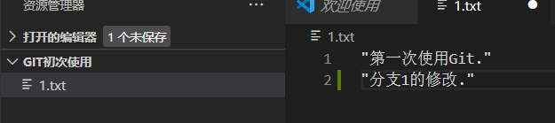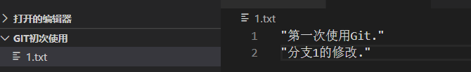 我们对分支1中的test文件进行修改,修改内容具体为在里面添加了一句话“分支1的修改.”