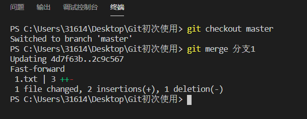我们此时要将分支1合并到master分支上,那么我们要先切换到master分支中,然后再执行git merge master。