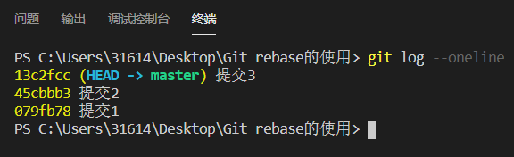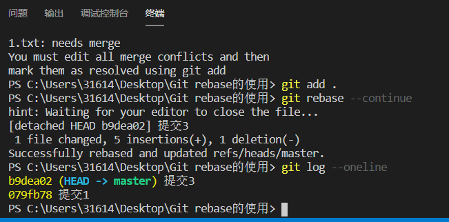 之后删去提交2,再处理冲突,执行git add .和git rebase --continue等操作之后,可以看到提交2已经不见。