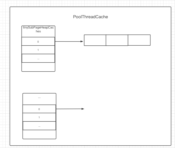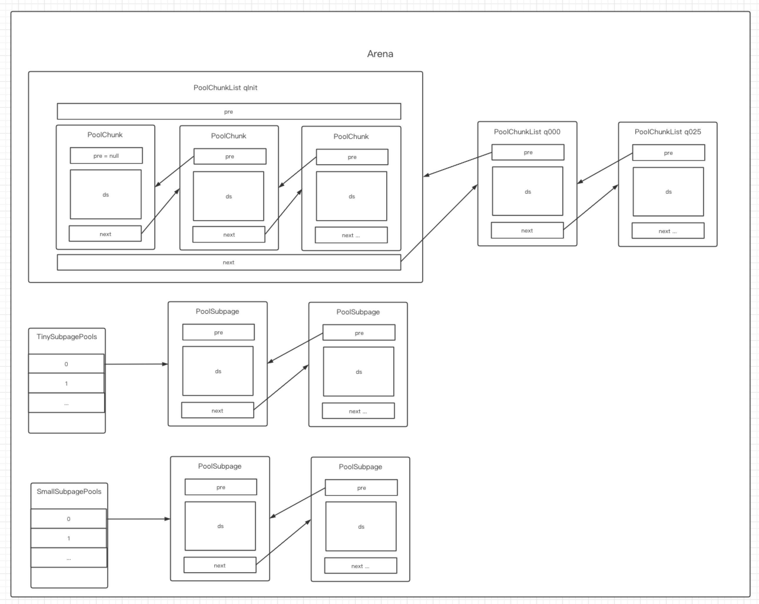线程通过 Arena 向 JVM 和操作系统申请内存。上面已经讲过了 Cache 的机制,PoolArena 申请内存的时候,小于 huge 的内存是以 PoolChunk 为基本单位申请的,释放的时候,也是先释放到 PoolChunk 当中,如果 PoolChunk 全部释放完毕,才会归还给 JVM 或操作系统。下面我们先看下 PoolArena 当中的数据结构,如下图: