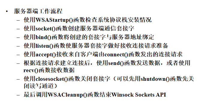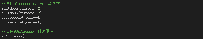 在程序的最后需要调用shutdown()关闭套接字,closesock()释放套接字,以及使用WSACleanup()结束ws2_32.lib的调用,相关代码如下: