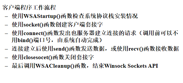 在结束调用后,则可以通过WSACleanup()来中止ws2_32.lib的使用。