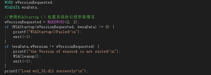 为了检查winsock是否已被正确链接到程序中,还可以通过如下代码检查协议栈安装情况: