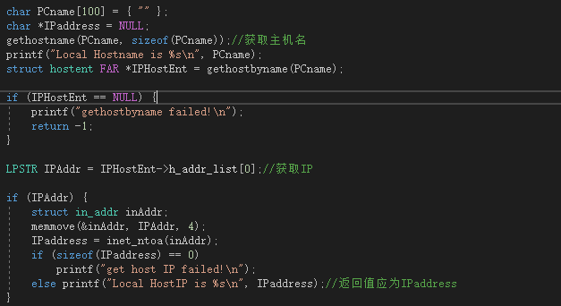 为了实现网络程序间的交互,服务器端首先需要获取自身的IP地址以填充Socket,这就需要依次调用gethostname()函数获取主机名称,再通过gethostbyname()函数获得主机名称对应的IP地址。相应代码如下: