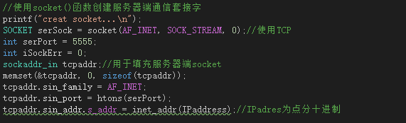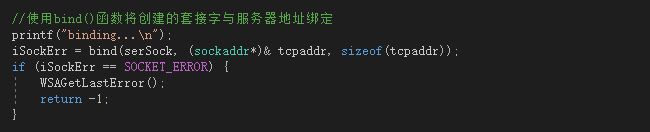 首先初始化了一个Socket,并且通过相关字段指明该Socket工作于TCP/IP网络上的TCP中(AF_INET,SOCK_STREAM)。接着又完成了服务器端地址的填充,其中包括协议族,端口和IP地址三个内容。而该地址则用于接下来的绑定端口中: