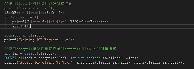 服务端在配置好Socket则在对应端口进行监听,等待客户端的连接请求,此时使用的函数为listen(),该函数为对应Socket建立一个输入数据队列,将到达的服务请求保存在队列中,直到程序对之进行处理,即等待accept()。accept()函数原型如下: