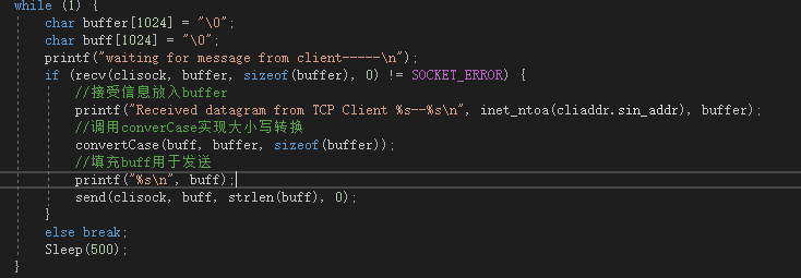 首先分析原先的服务器端代码,可以发现程序会在accept()处进入阻塞,直到接收到连接请求。因此首先就应该将accept()放入循环之中,反复接收来自客户端的连接请求。而在建立连接后,创建一个线程处理该连接的数据传输和连接管理,主程序重新循环等待下一个客户端的连接请求,相关代码如下