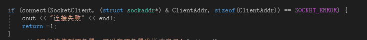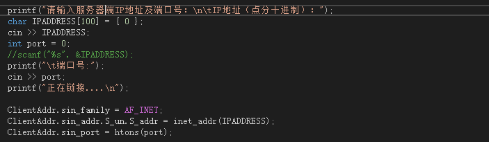 不同于服务器端无需预先了解客户端的地址信息,客户端则应该预先了解服务器端所在的IP地址和端口,因此在本次实验中通过如下代码实现了这一功能: