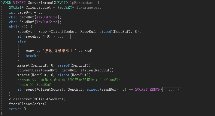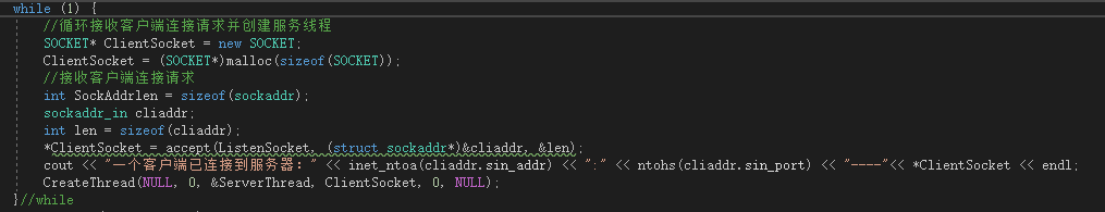 结合之前的代码,即将accept()创建的套接字ClientSocket作为参数传递给线程执行的回调函数ServerThread(),而Servethread()相关代码如下: