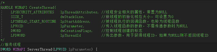 线程部分调用了WINAPI提供的函数CreateThread()函数,该函数原型如下:
