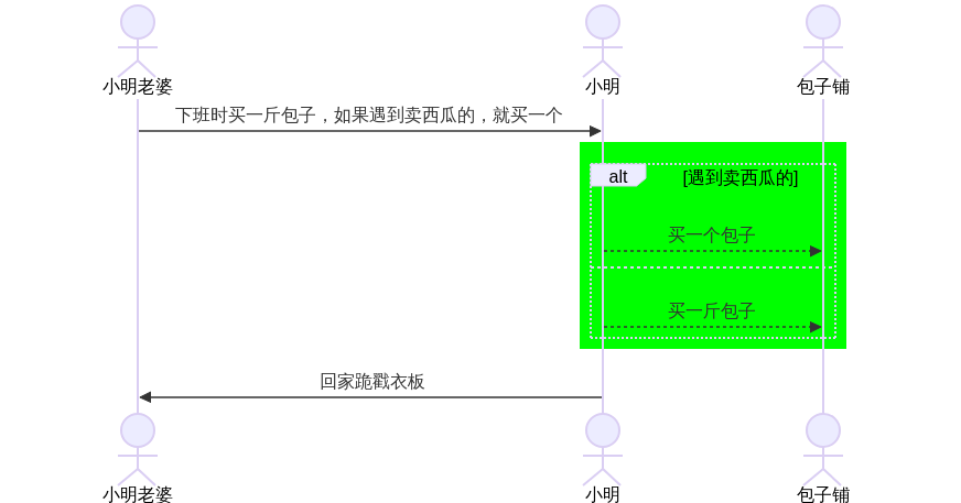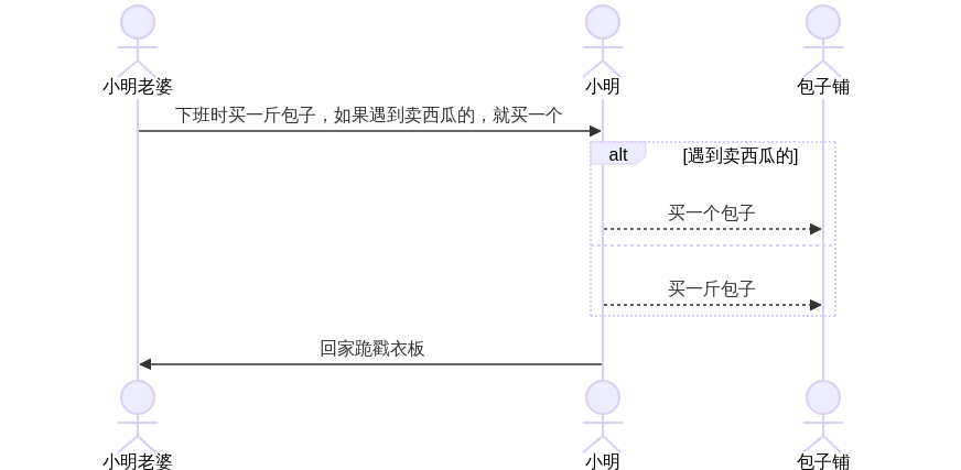 后来小明的女朋友成了他老婆,有一天小明老婆让小明下班时买一斤包子,如果遇到卖西瓜的,就买一个。图示如下: