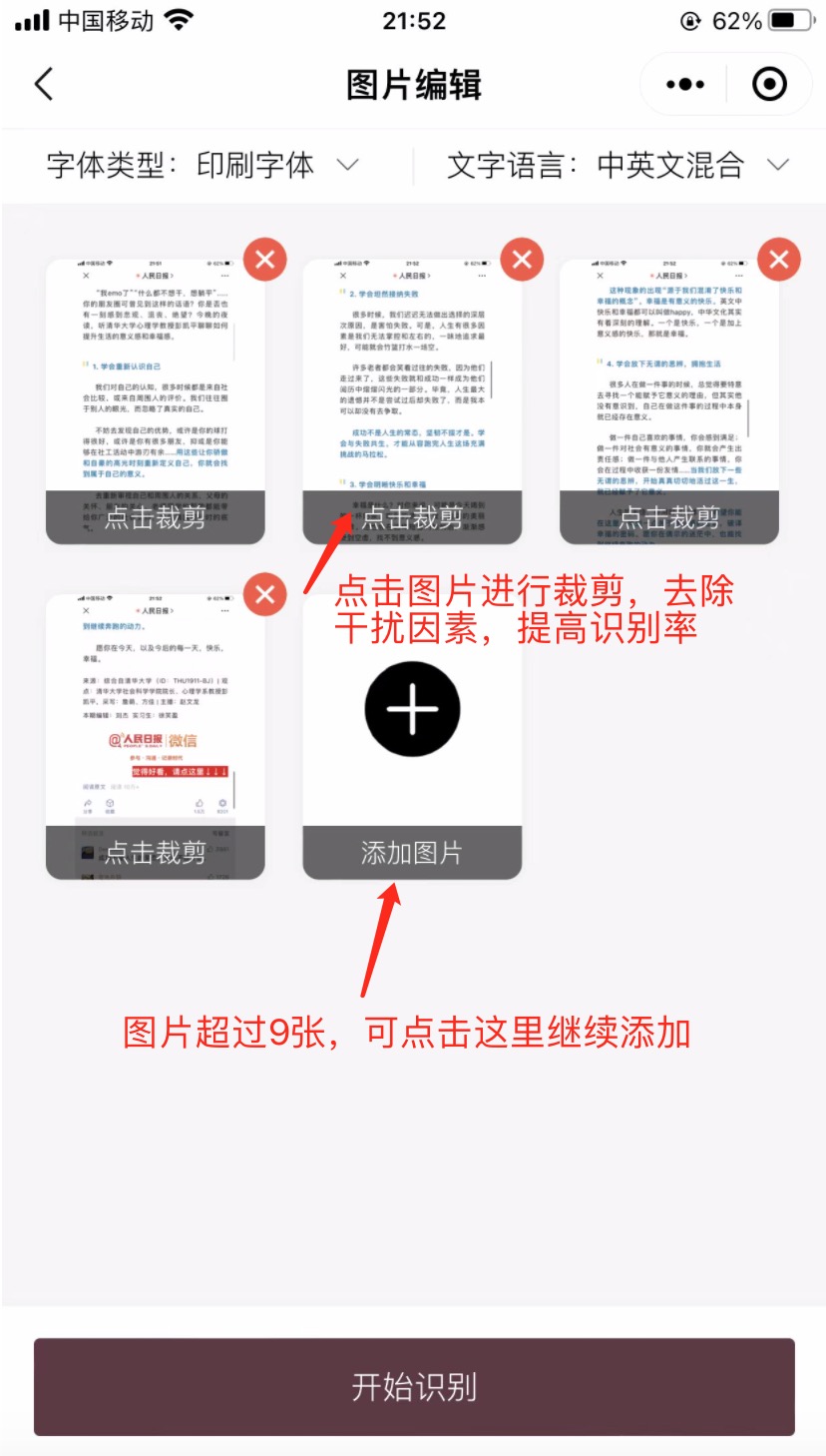 根据需要对图片进行裁剪,去除其他无关的干扰因素,提高图片识别的准确率。点击“添加图片”,可继续添加更多的图片。然后点击“开始识别”。