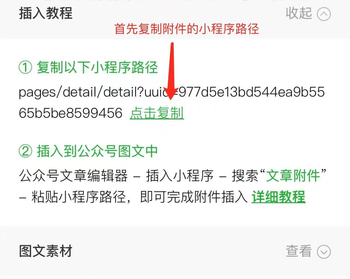 把文件通过微信传送到手机上,把文件上传到“文章附件”小程序里,获得附件对应的小程序路径。