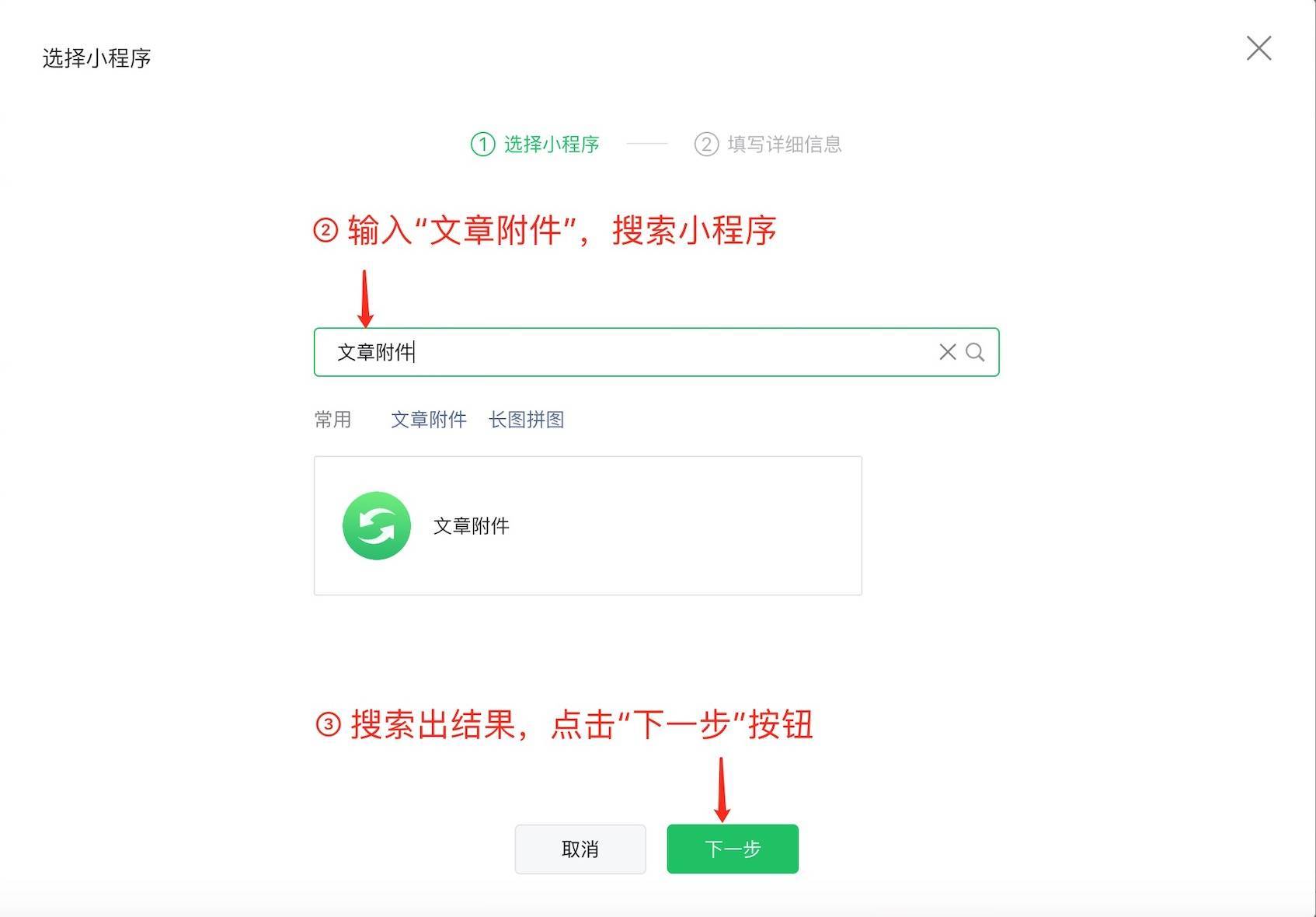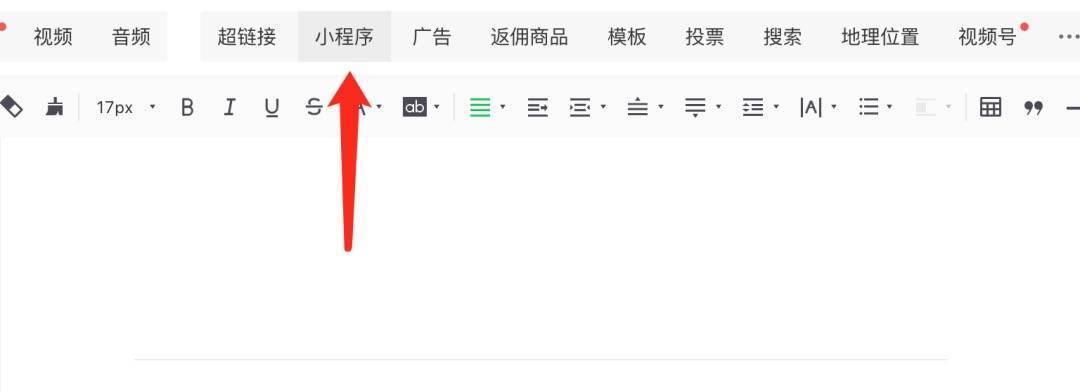 回到公众文章编辑器,在编辑器顶部点击“小程序”,并搜索找到小程序,点击下一步。