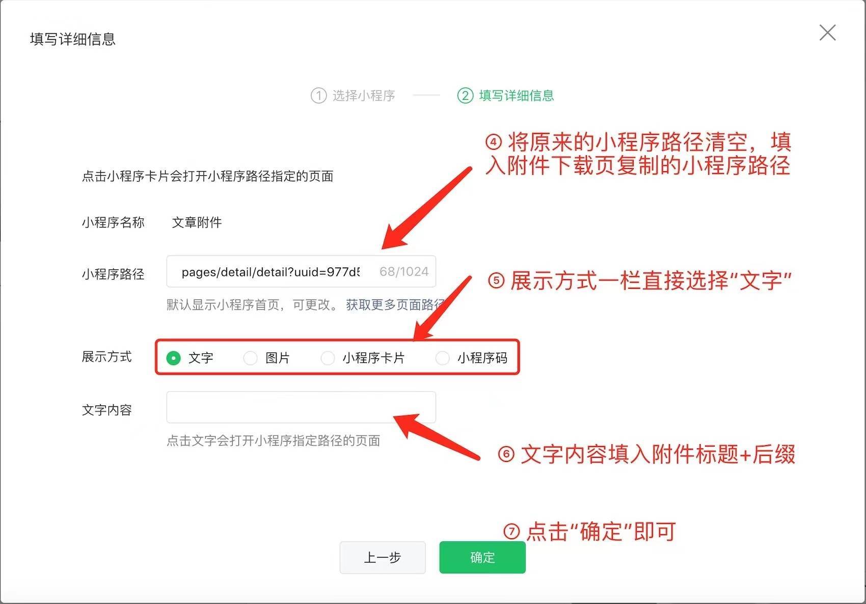 将步骤一复制的小程序路径填入“小程序路径”一栏,展示方式一栏选择“文字”,将附件标题+后缀填入“文字内容”一栏,点击确定即可。