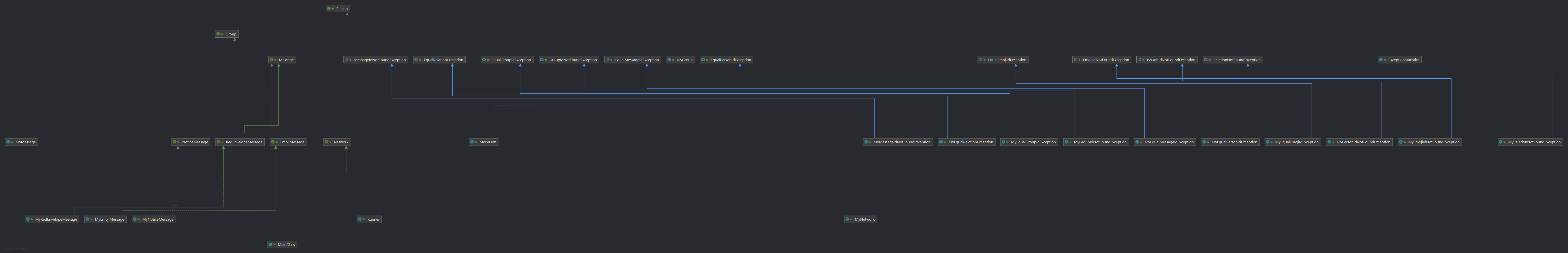 我们定义了一堆异常类,方便在处理各种异常时进行抛出异常,然后主类控制整个程序的运行,Person类存放一个人的各种属性(id,姓名,年龄,钱),以及与其他人的关系(是否认识,以及他们的权值),还有收到的信息;MyGroup类存放一组Person,方便对一组人进行管理和共同分发消息等;Message类存放消息,有一个属性为SocialValue,多次进行社交,可以提高个人的社交值,传递的消息既可以从一个人传到另一个人,也可以从一个人传给一组人。它有两个继承的子类,分别是EmojiMessage,RedEnvelopeMessage,区别在于传递的消息的附加效果,RedEnvelope的附加效果是会附加金钱交易,EmojiMessage会增加热度。