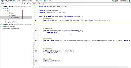 * 将来我们自定义一个类,实现Servlet接口,复写方法。