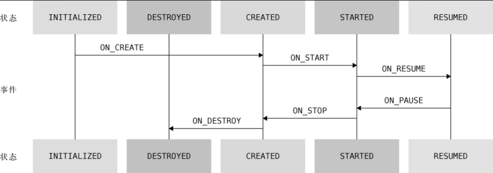 lifecycle.currentState返回的生命周期状态是一个枚举类型,一共有INITIALIZED、DESTROYED、CREATED、STARTED、RESUMED这5种状态类型。它们与Activity的生命周期回调所对应的关系如图所示。
