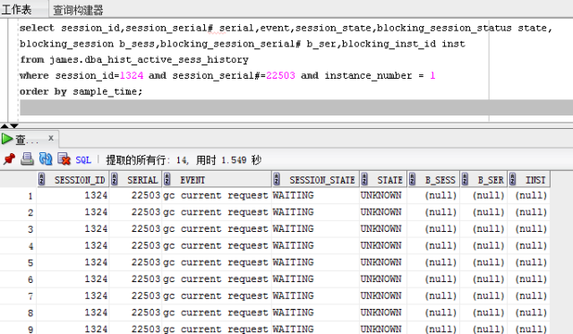 3. session#1324,serial#22503 也是处于等待状态,等待事件是'gc current request'