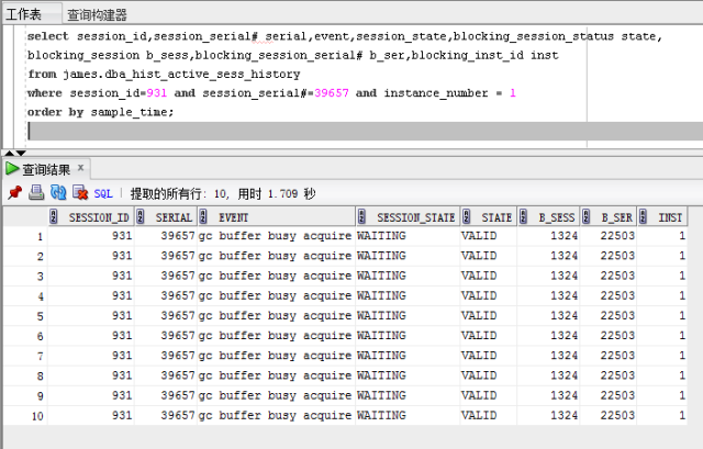 2. session#931,serial#39657 也是处于等待状态,等待事件是'gc buffer busy acquire',而'gc buffer busy