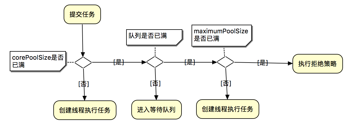 当在execute(Runnable)方法中提交新任务并且少于corePoolSize线程正在运行时,即使其他工作线程处于空闲状态,也会创建一个新线程来处理该请求。 如果有多于corePoolSize但小于maximumPoolSize线程正在运行,则仅当队列已满时才会创建新线程。 通过设置corePoolSize和maximumPoolSize相同,您可以创建一个固定大小的线程池。 通过将maximumPoolSize设置为基本上无界的值,例如Integer.MAX_VALUE,您可以允许池容纳任意数量的并发任务。 通常,核心和最大池大小仅在构建时设置,但也可以使用setCorePoolSize和setMaximumPoolSize进行动态更改。