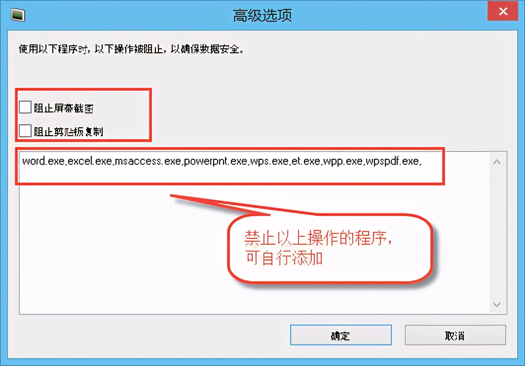 禁止截图和禁用剪贴板是针对某个软件的,可以把需要的软件进程添加到阻止列表中,如下图所示: