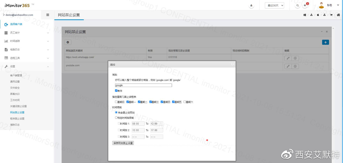 iMonitor 365 远程监控软件 网页禁止功能,可以限制客户端电脑的上网浏览,对于公司来说,一些娱乐性的视频,游戏,炒股的类型的网页加入黑名单后,员工打开被禁止的网页时会强制跳转到空白页。
