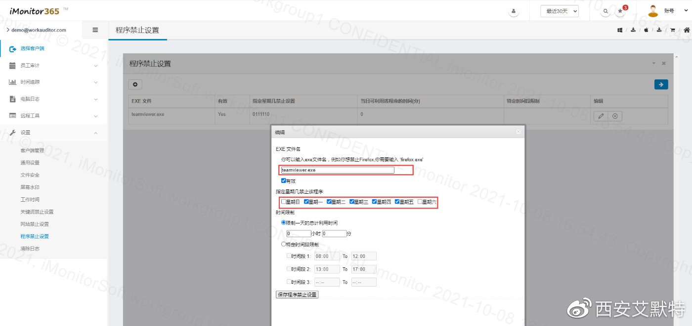 iMonitor 365 程序禁止设置,把软件对应的进程加入到黑名单列表后,软件将被强制禁止,无法打开使用。