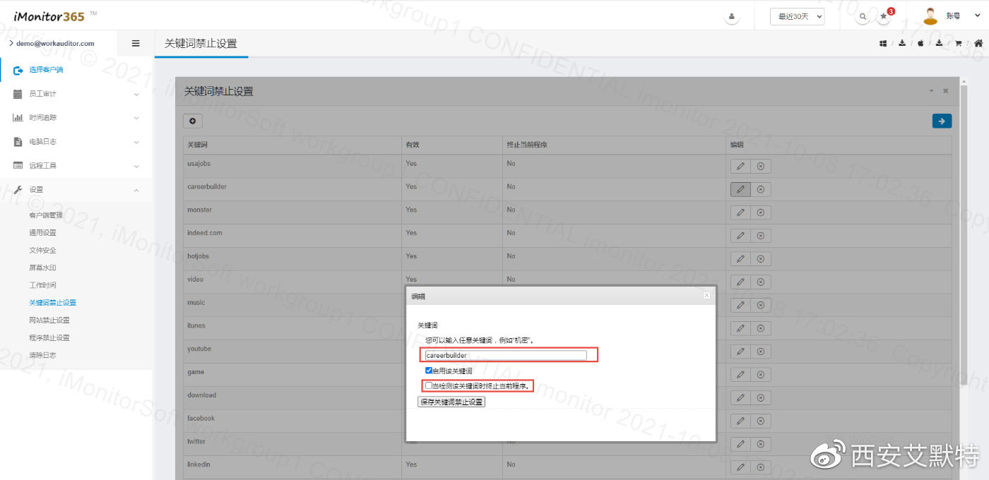 iMonitor 365 关键字禁止设置,进行网页设置时,必须输入对应的网址才会生效,那同一类型的网页有很多,那么对于同一类型的可以设置成同一个关键字,比如小说,游戏等,当检测到这些字时,就会立刻截屏,并关闭掉打开的网页。